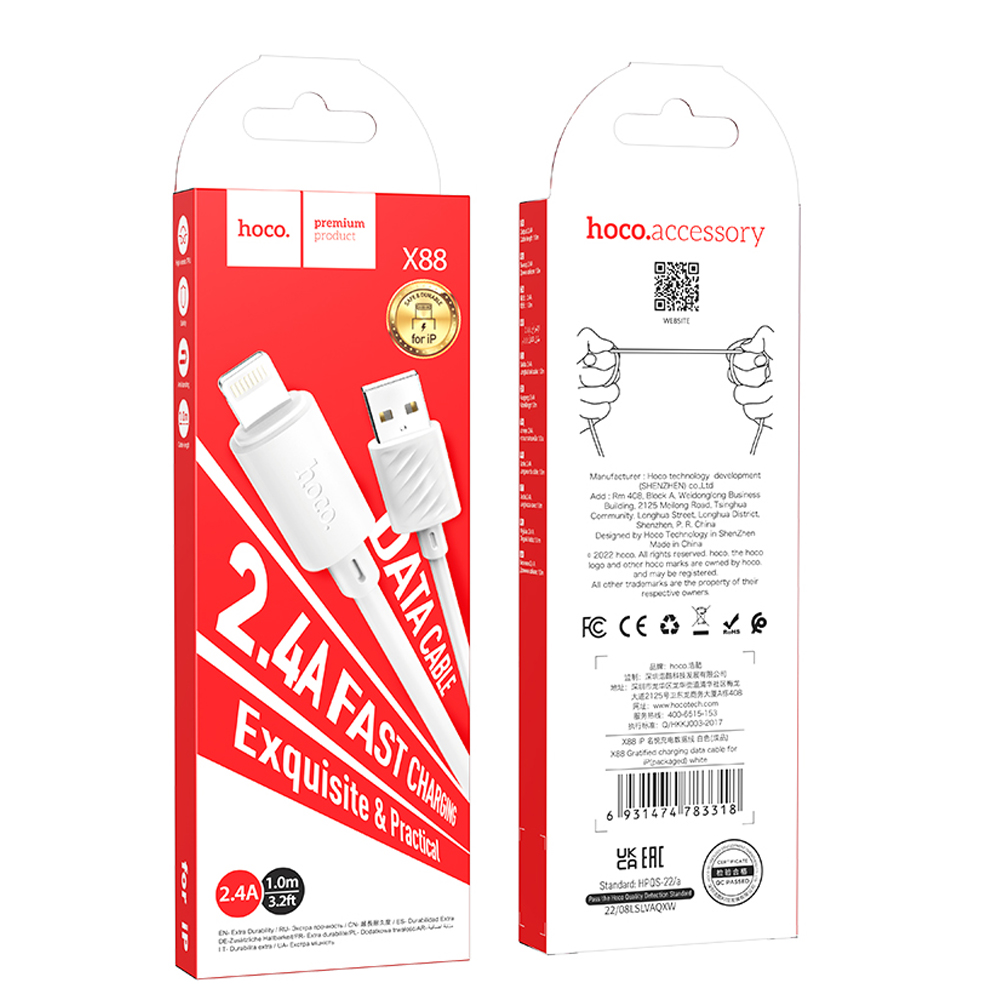 Кабель USB - 8 pin HOCO X88 Gratified, 1.0м, 2.4A, цвет: белый, не упакован