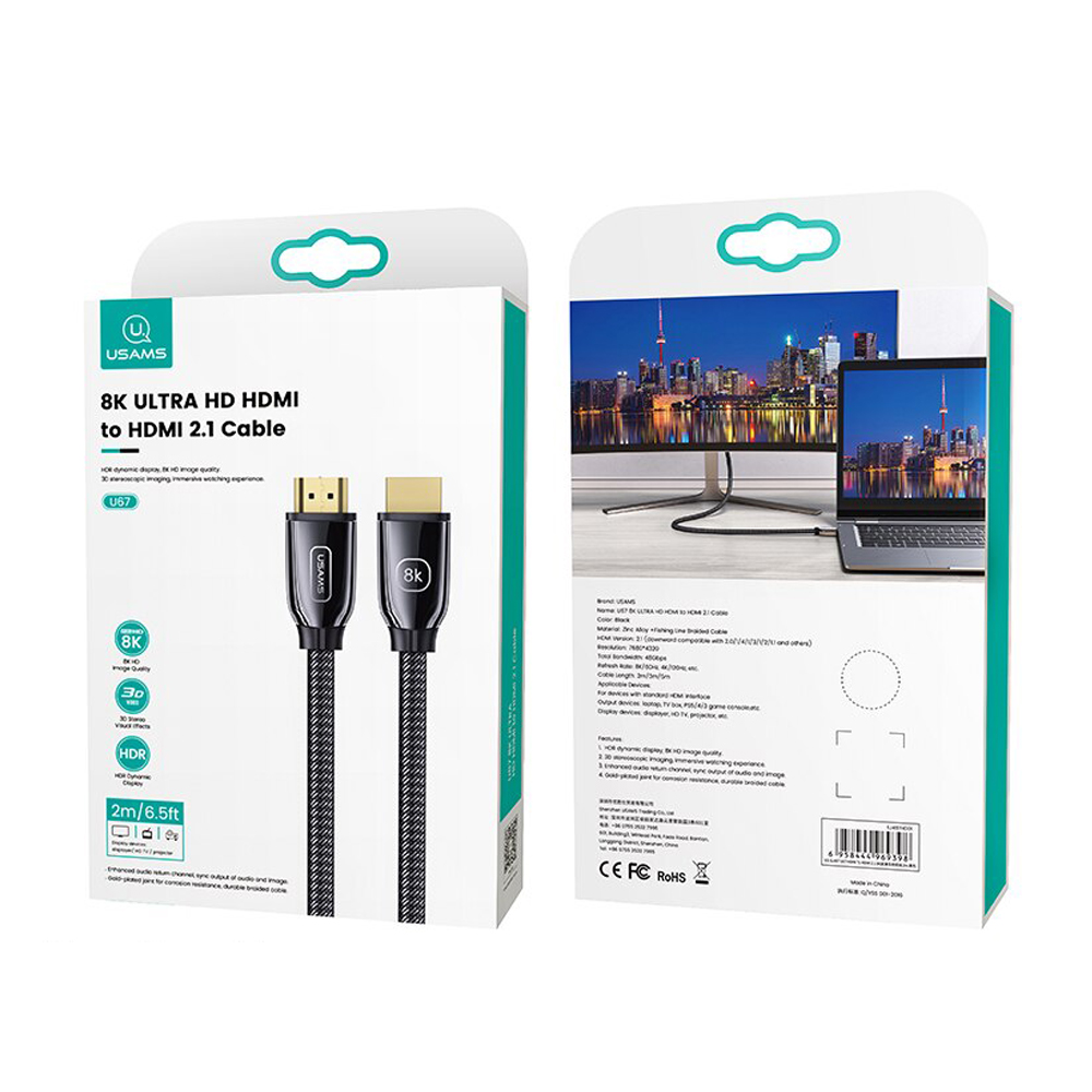 Кабель HDMI - HDMI 2.1 Usams US-SJ499 U67, 5.0м, 48 Гбит/с, 8K ULTRA HD, 7680*4320, цвет: чёрный