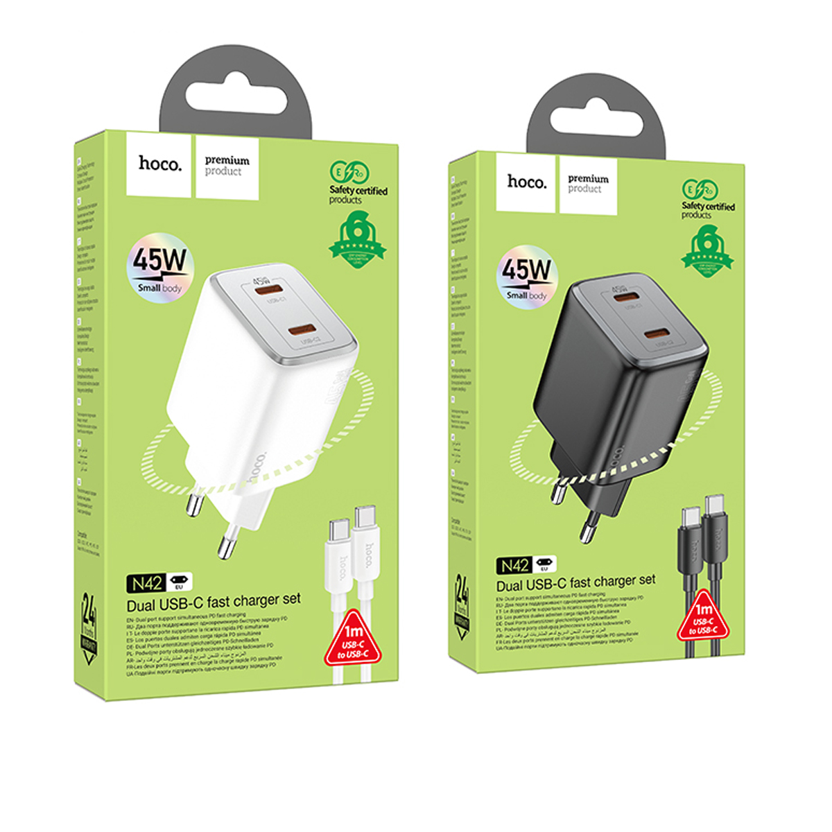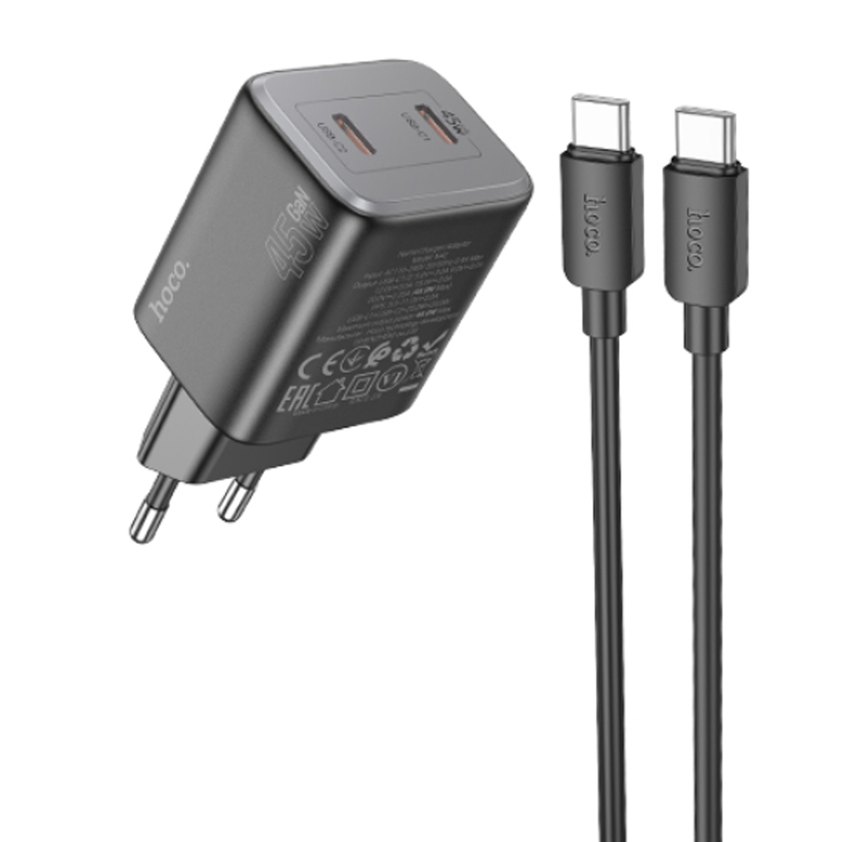 Блок питания сетевой 2 Type-C HOCO N42 , Elogiado, PD 45Вт, кабель Type-C, Type-C, 1.0м, цвет: черный, мятая упаковка