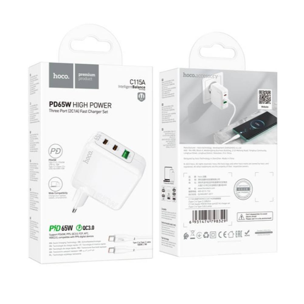 Блок питания сетевой 2 Type-C, USB HOCO C115A, Header, 65Вт, QC, FCP, AFC, кабель Type-C-Type-C, цвет: белый