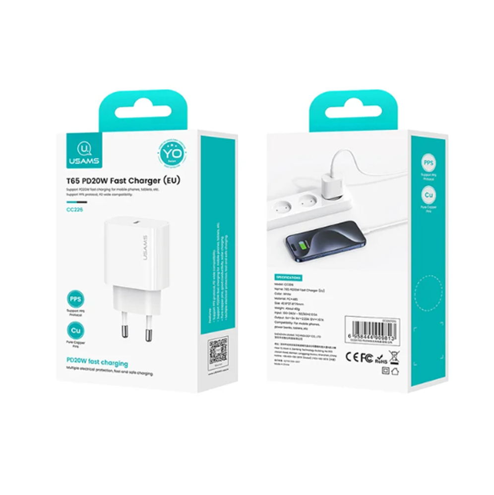 Блок питания сетевой Type-C Usams US-CC226, Kit - Yi Series, PD 20Вт, кабель US-SJ712 Type-C-8 pin 30Вт, цвет: белый, (арт.OYXLTZ02)