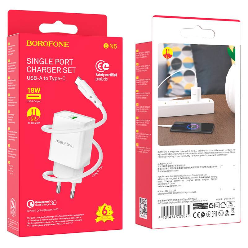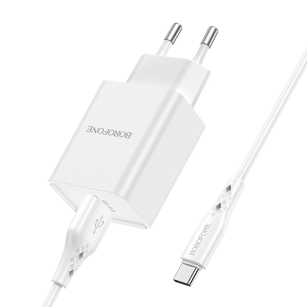 Блок питания сетевой 1 USB Borofone BN5, Jingrui, 18Вт, QC3.0, QC2.0, кабель Type-C, цвет: белый-1