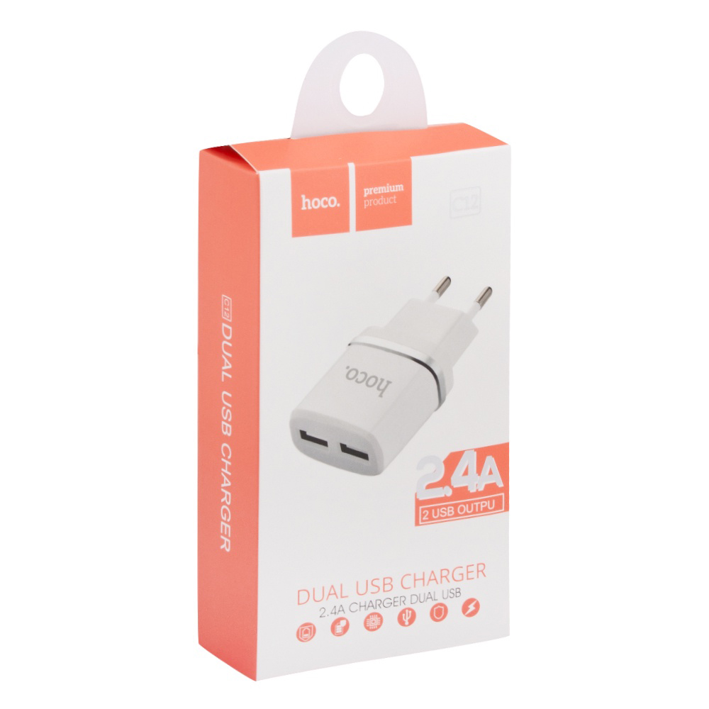 Блок питания сетевой 2 USB HOCO C12, 2400mA, 12Вт, цвет: белый, мятая упаковка-1