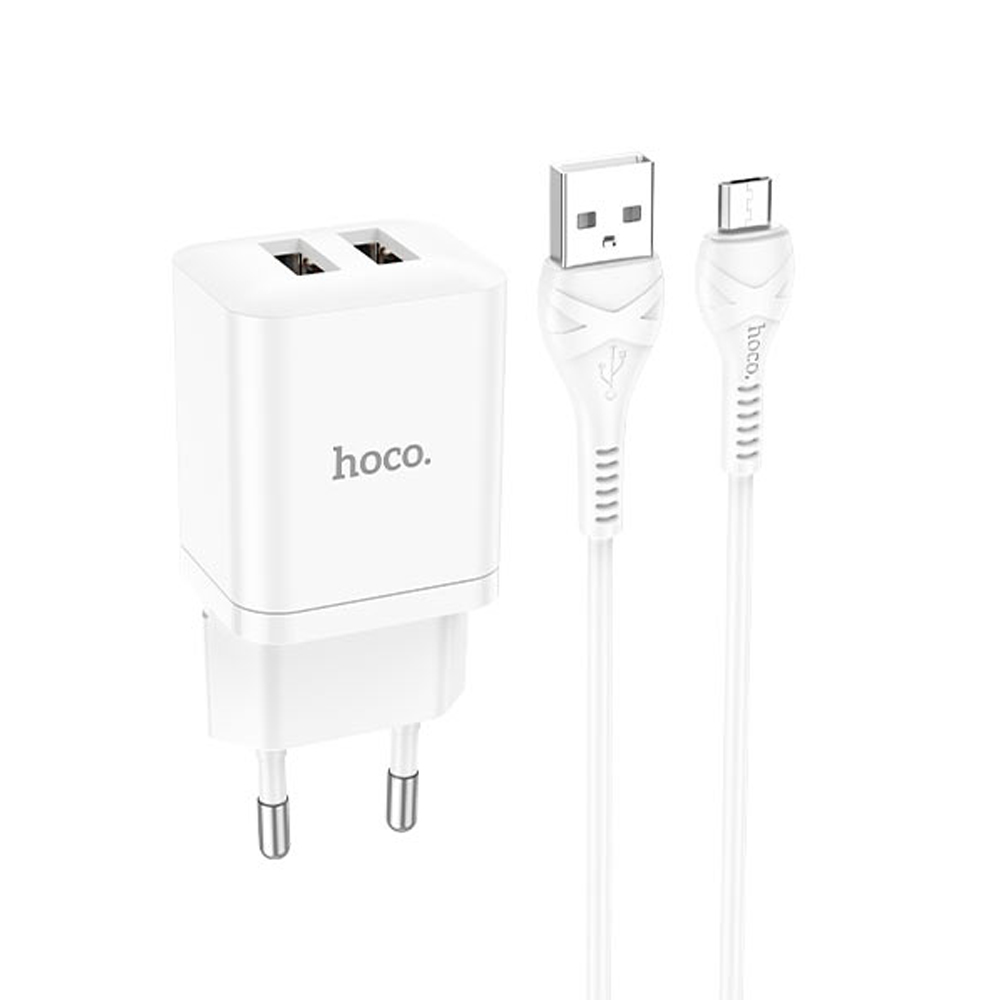 Блок питания сетевой 2 USB HOCO N25, Maker, 2100mA, кабель микро USB, цвет: белый, мятая упаковка-1