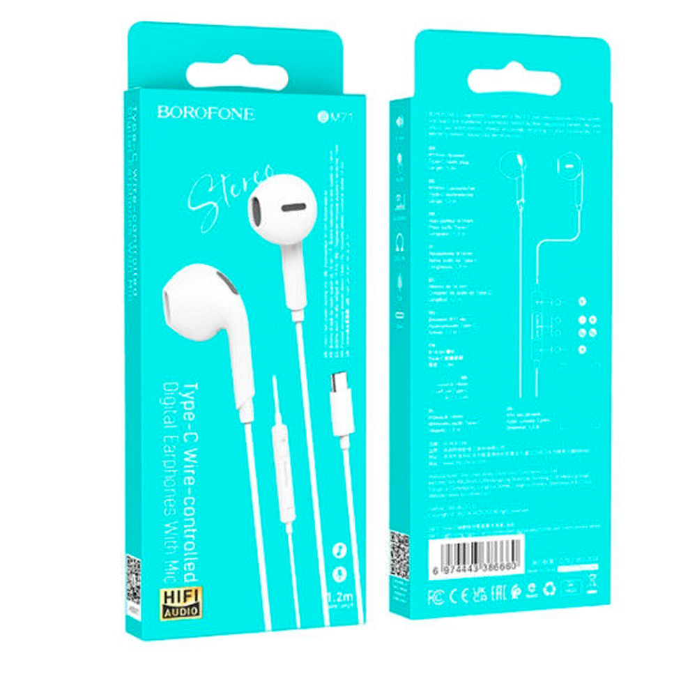 Наушники внутриканальные Borofone BM71, Light song, Type-C, 1.2 м, цвет: белый