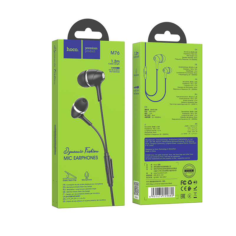 Наушники внутриканальные HOCO M76, Maya, Jack 3.5мм, 1.2 м, цвет: чёрный-1
