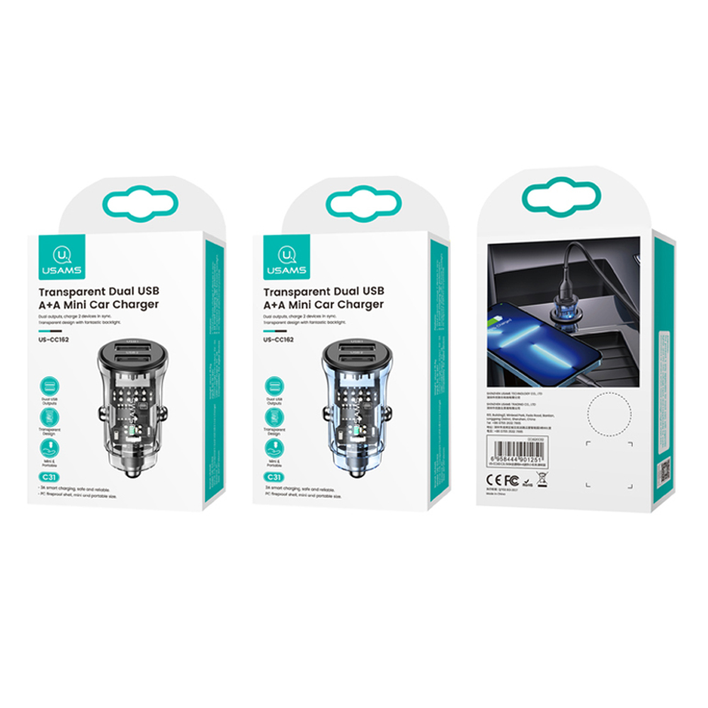 Блок питания автомобильный 2 USB Usams US-CC162, C31, 3000mA, 30Вт, цвет: чёрный-1