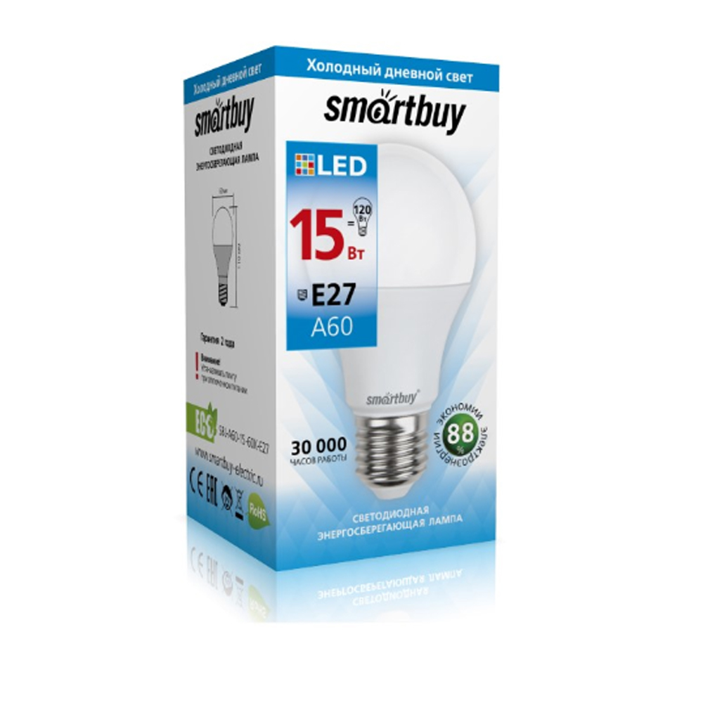 Лампа светодиодная SmartBuy A60, E27, груша, 15Вт/220-240V/6000К, мятая упаковка